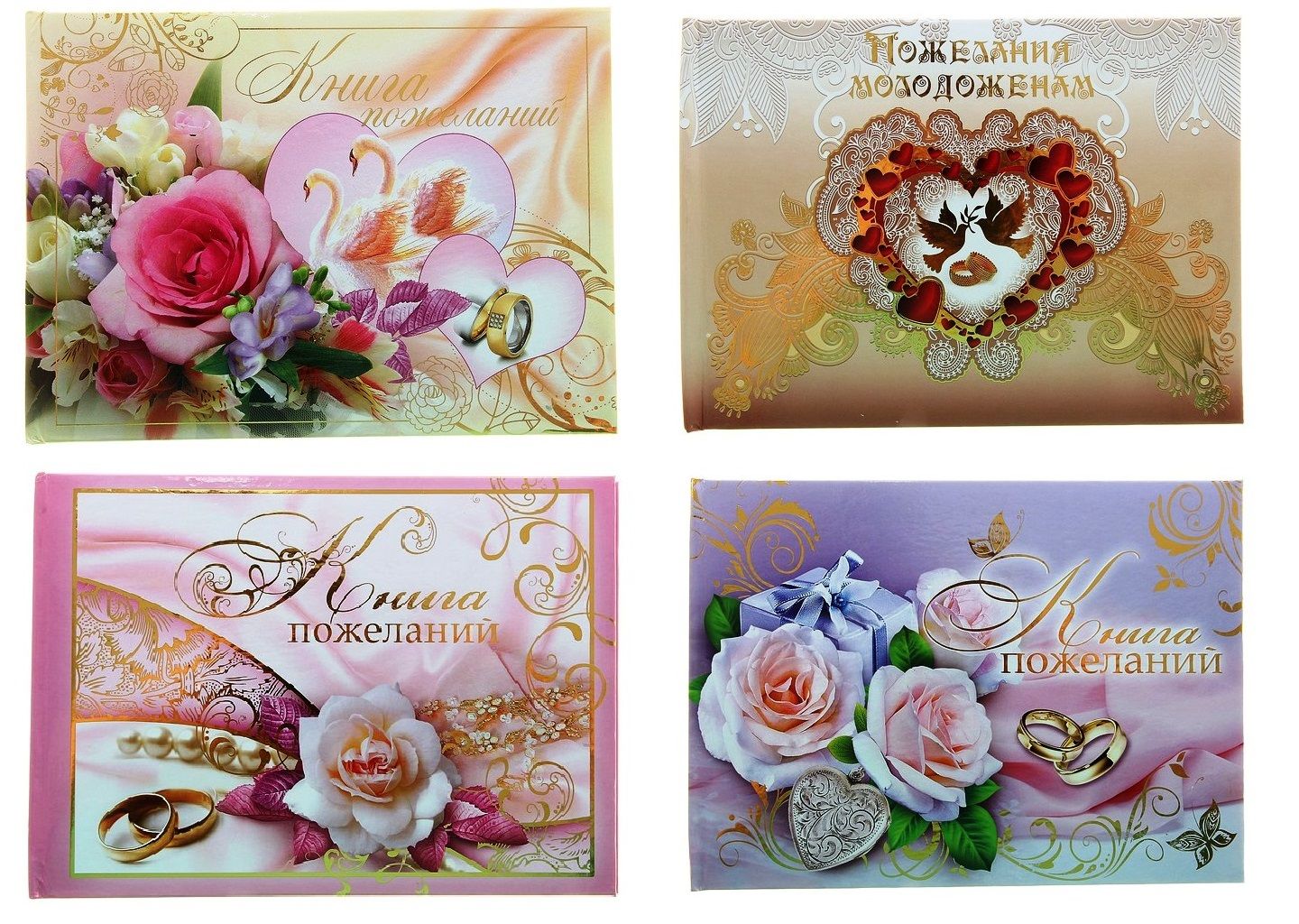 Каждый лист с оригинальным орнаментом специально разлинован и разделён на два блока: один — для фамилии и имени поздравляющего, другой — для самого пожелания. Обложка книги сделана из картона с изображением свадебных фотографий и узорным тиснением под золото.