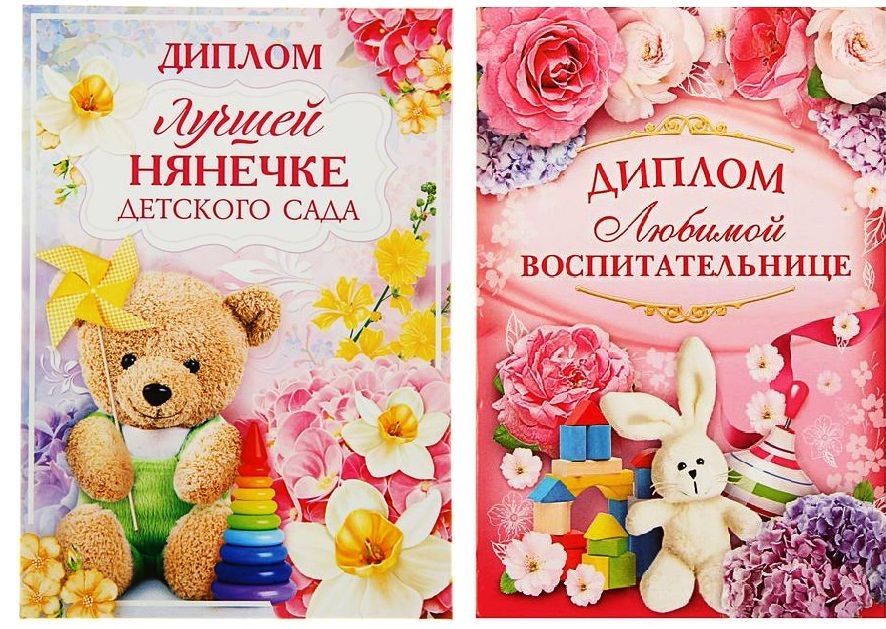 Диплом "Лучшей нянечке детского сада" — прекрасный вариант оригинального поздравления. Изящные изображения, тёплые искренние слова, поле для имени получателя и список достижений — вот яркие черты этого аксессуара.